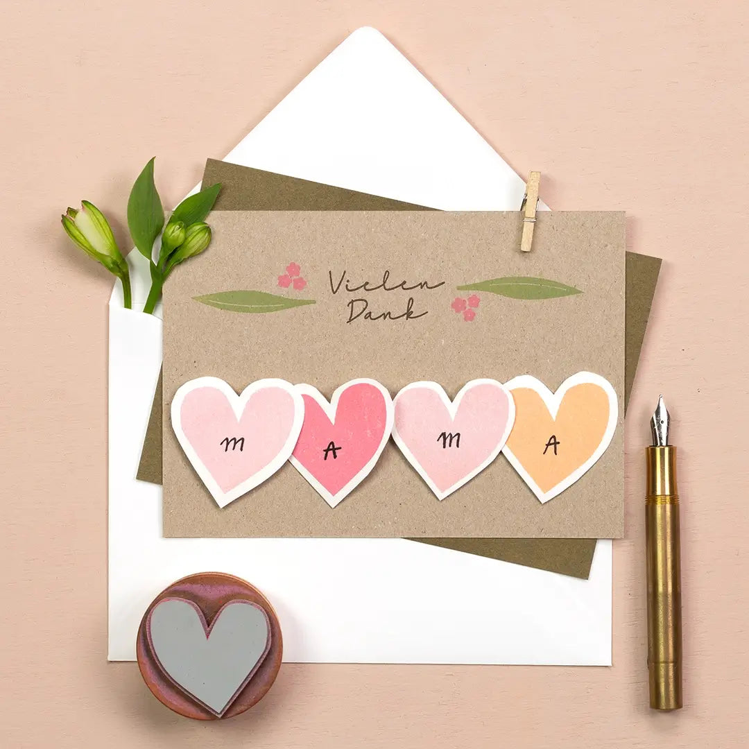 Bringt Herzlichkeit aufs Papier einer Muttertagskarte: Mit großen Stempel Herzen als Luftballons und einer Schnur gezeichnet, mit mini Herzchen als verstreutes Muster oder mit einem Gesicht und Ärmchen als kleine Herzensmenschen und zeigt so euren Mamas ganz persönlich, wie gern ihr sie habt.