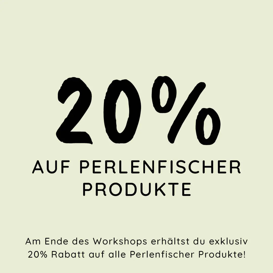 Du erhältst von uns eine Goodie-Bag mit verschiedenen Materialen im Wert von 15€, Getränke, kleine Snacks und exklusiv 20% Rabatt auf alle Perlenfischer Produkte!