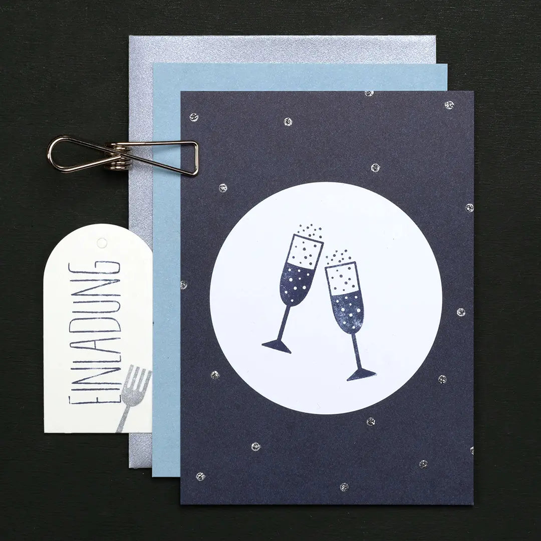 Stamp your own invitation cards for your party. With champagne glass, glitter and co. your invitation is a guaranteed eye-catcher.
