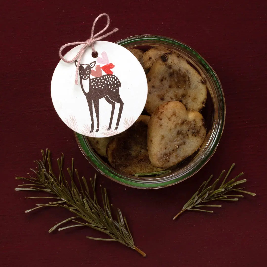 Beautifully package your homemade cookies at Christmastime in a festive way by putting them in a jar, bag or tin and dressing them up with a self-stamped paper tag and twine.