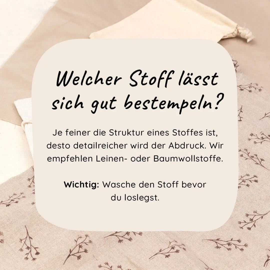 Am besten lassen sich Naturstoffe wie Leinen oder Baumwolle bestempeln, da ihre feine Struktur die Motive detailreich abbildet. Kunstfasern hingegen nehmen die Farbe oft nicht so gut auf und eignen sich daher weniger.