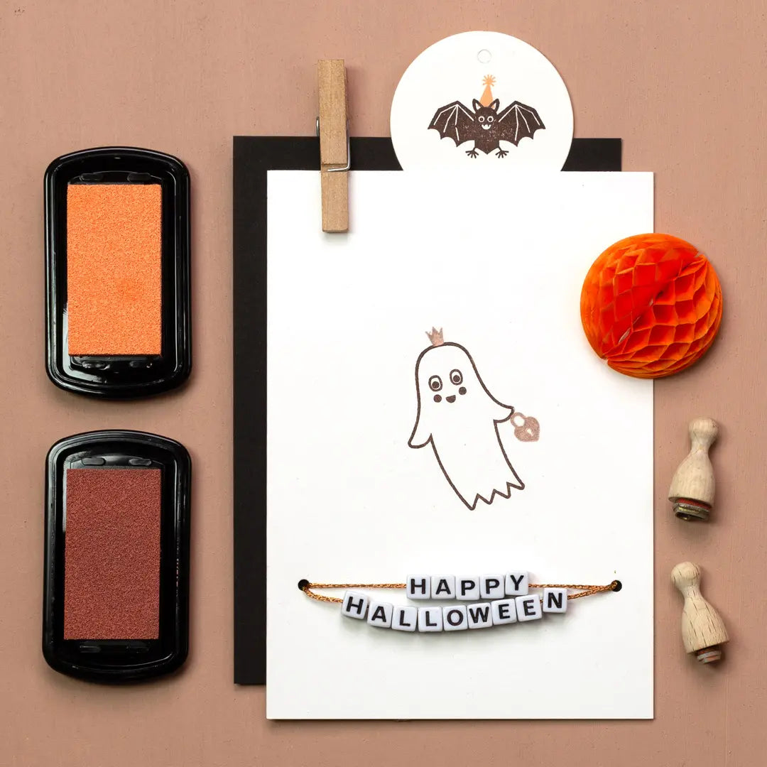 Simply stamp your Halloween invitations by yourself! Here we have made a great letter chain with yarn, which you can of course also use for many other occasions.